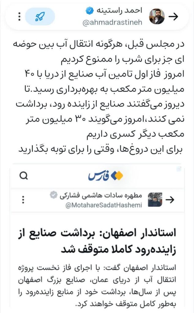 تا دیروز می‌گفتند صنایع از زاینده رود، برداشت نمی کنند، امروز می‌گویند ۳۰ میلیون متر مکعب دیگر کسری داریم برای این دروغ‌ها، وقتی را برای توبه بگذارید