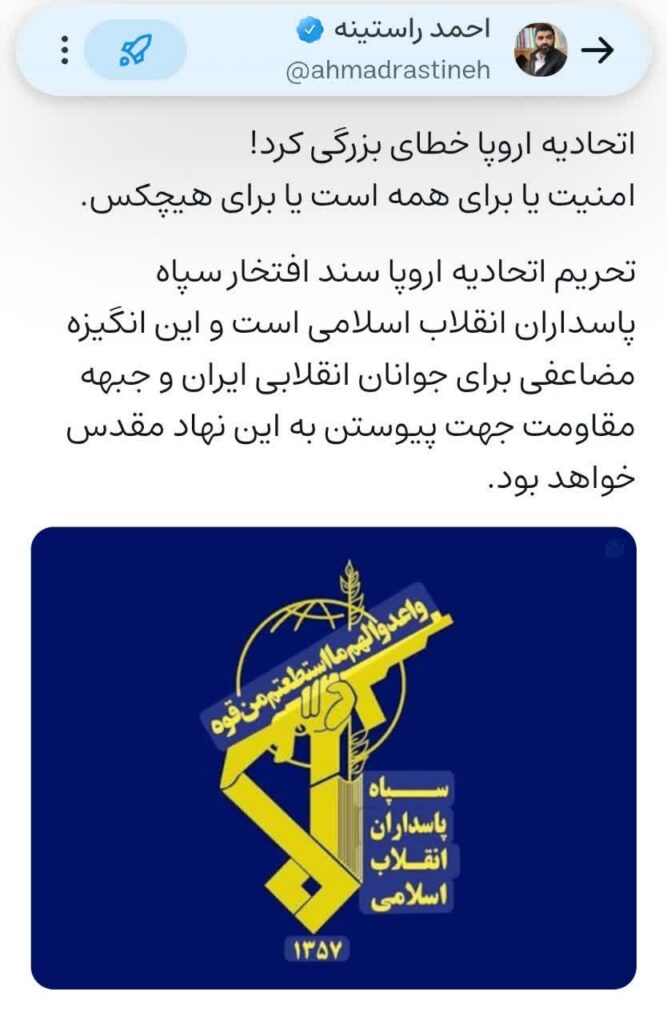 احمد راستینه؛ سخنگوی فراکسیون دفاع و اقتدار ملی مجلس در واکنش به تحریم شدن سپاه پاسداران توسط اتحادیه اروپا در حساب ویراستی خود نوشت :